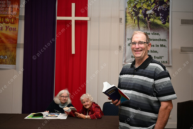 Werribee Church of Christ, free English speaking club. Pic of pastor Garry Cowley (front), with church members Moira Ings and Bronwen Hickman. (Damjan Janevski). 532868_02