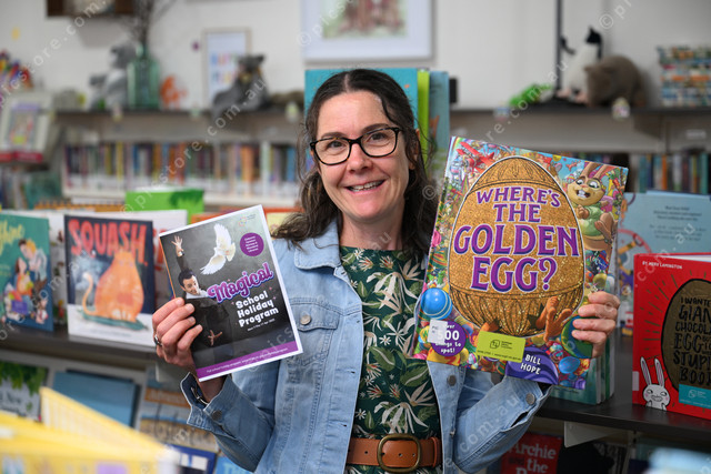 Pic of Romsey Library librarian Rae Good holding some books and easter-related material related to their upcoming school holiday programs. Photo b Damjan Janevski. 468871_01