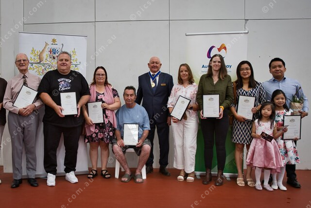 Newly minted Australians Colin Mison, Andrew Close, Fleur Garmonsway, Richard Keylock, Light Mayor Bill Close, Tracey Loveridge, Alexandra Alavoine, Rosnah Galo, Alfren Galo, Hannah Galo and Yumi Galo. (530709_06)