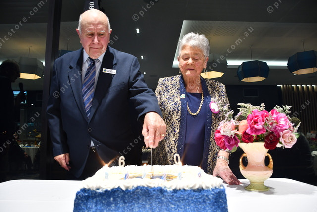 Celebrating the milestone, Ian Hollick and Glenys Cocks share a cake-cutting moment at the Murray Bridge Lions’ 60th anniversary.