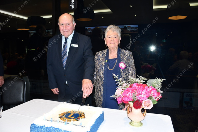 Ian Hollick and Glenys Cocks cut the cake at the Lions Club of Murray Bridge’s 60th anniversary celebration.