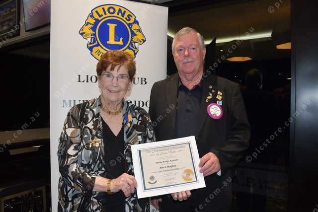 Ian Crane presents a life membership to Murray Bridge Lions Club president Ann Hughes.