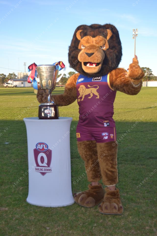 Brisbane Lions mascot Roy and the 2024 Premiership trophy visits the South Burnett Saints training session. 476175_02