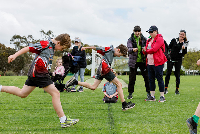 Cole Elson (closest to camera) and Angus Bishop cross the finish line in the 100m sprint. (508648_36)