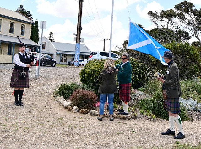 Caitlin Fry plays the bagpipes while Hazel Douglas, Dave Stewart, and Andrew Staniford raise the flag. (Mark Liebich: 521875_05)