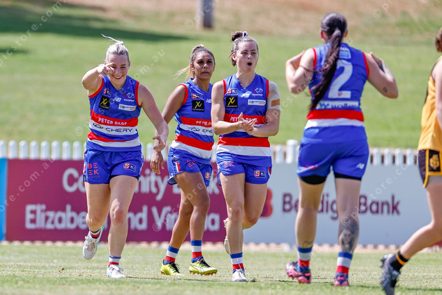 Lauren Breguet, Tesharna Maher and Alysha Healy celebrate one of Katelyn Rosenzweig’s two goals. (465908_02)