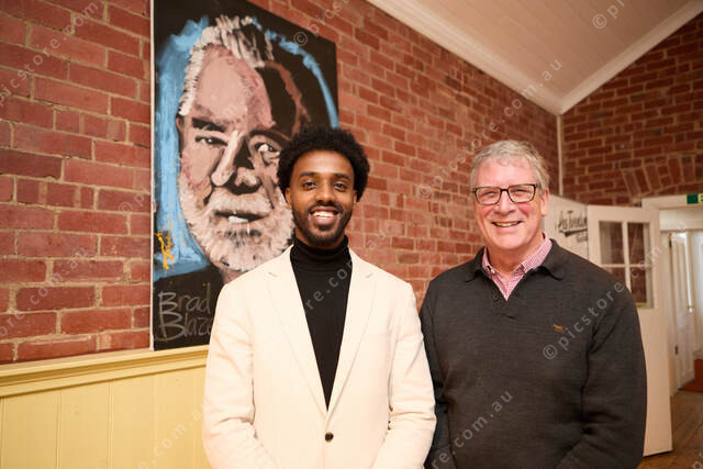 Cr Mohamed Semra – City of Maribyrnong and Pual Burke (CEO of the Les Twentyman Foundation) with Les Twentyman in spirit (art)_Ljubica Vrankovic_480371_03