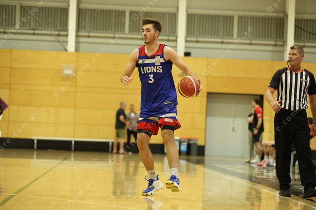 Spencer Gaze brings the ball up for the Central District Lions men’s reserves on Tuesday night. (Sharnee Jones: 466304_01)