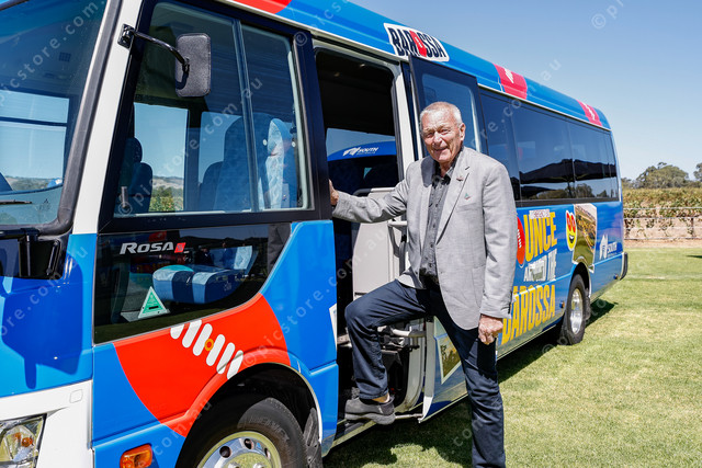 Barossa Mayor Bim Lange showing off the special new Bounce Around the Barossa buses. (467154_02)