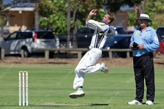 Salisbury West’s Justin Davies soars into his delivery stride. (467402_04)