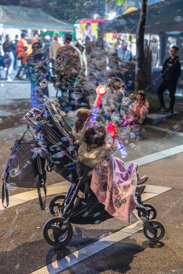 Two kids in a pusher with Bubble Guns. I shot this and then spoke to parents. They said ok if the kids couldn’t be identified.