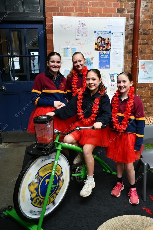 Sophie McAdam, Holly Abrahamson, Imogen Baulch on the bike, and Lara Johnstone ran a fruit smoothie stall with watermelons and oranges.