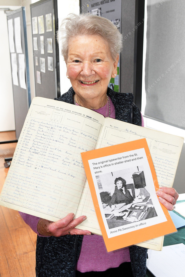 Anne McSweeney first name on the school roll in 1950 and a photo of her working in the office 509771_43