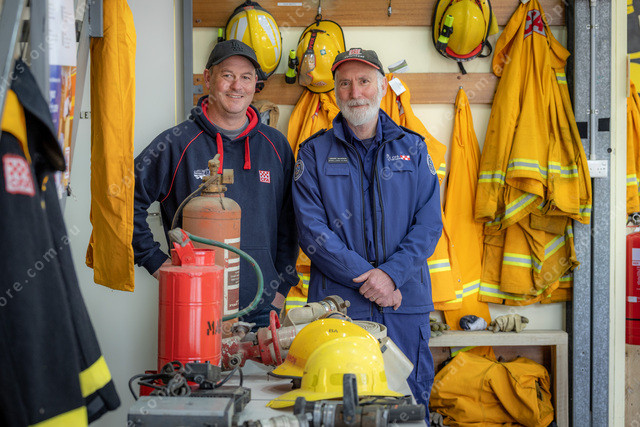 L-R Shane Tyler and Greg Mackinnon both members of Maryknoll CFA at the display of old equipment inside the fire station.