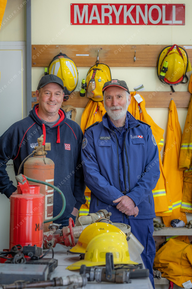 L-R Shane Tyler and Greg Mackinnon both members of Maryknoll CFA at the display of old equipment inside the fire station.