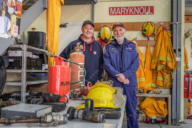 L-R Shane Tyler and Greg Mackinnon both members of Maryknoll CFA at the display of old equipment inside the fire station.