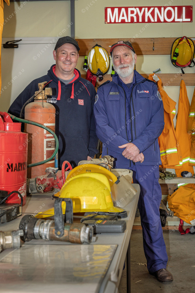 L-R Shane Tyler and Greg Mackinnon both members of Maryknoll CFA at the display of old equipment inside the fire station.