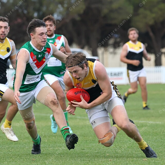 Angle Vale’s Lachlan Mitchell tries to evade Jacob Wotton. (478752_02)