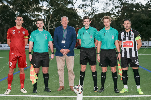 Barossa Council mayor Bim Lange OAM with captains and officials before kick-off. (478767_05)