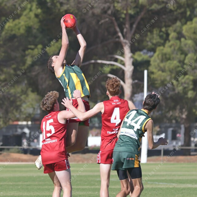 Two Wells’ Noah Henwood pulls down a mark while helping out with numbers for Balaklava. (480306_01)