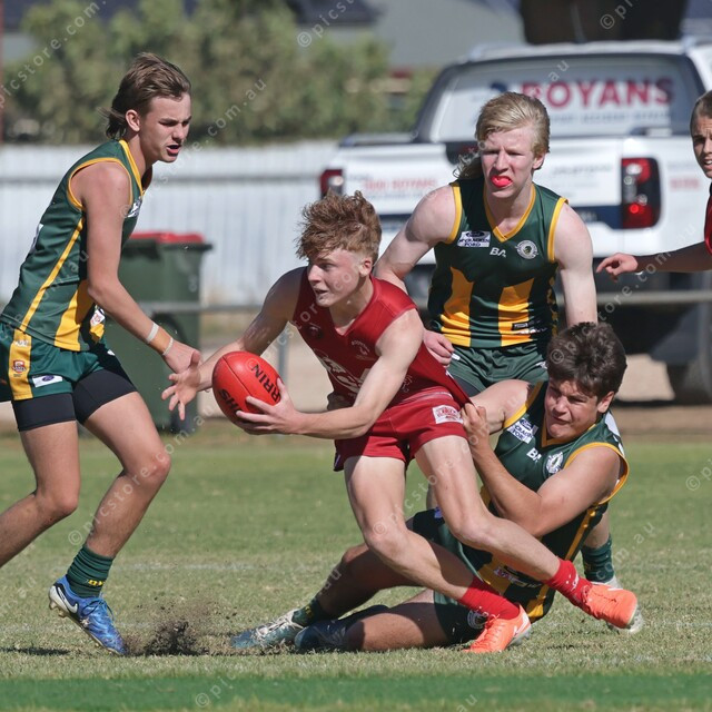 Hartley Bailley looks for a handball option as Aden Baker holds onto the tackle. (480306_05)
