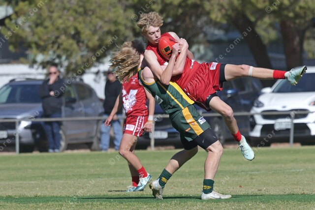 Balaklava’s Connor Willmer lifts Hayden Xenides in a slamming tackle. (Michael Slattery: 480306_06)