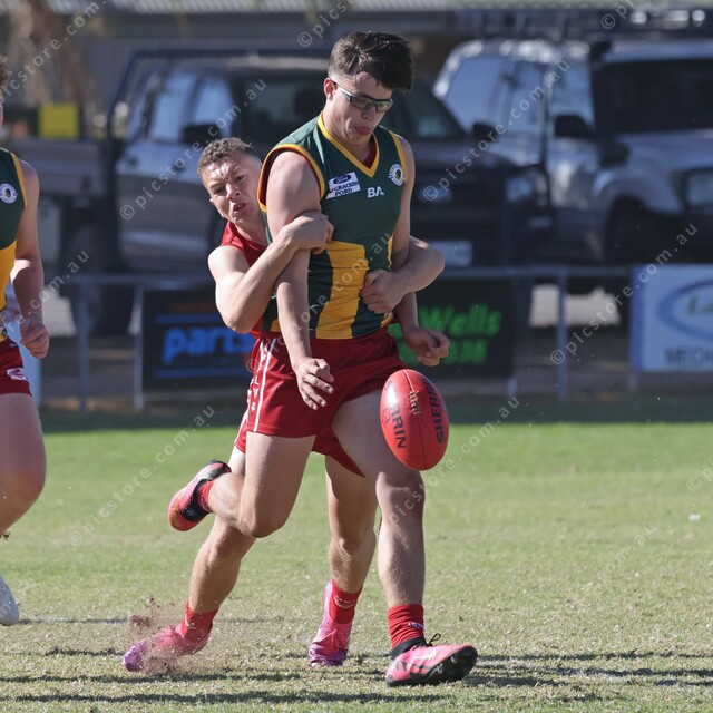 Ethan Ansell is tackled by Michael Davies as he tries to kick. (480306_07)