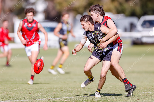 Nuriootpa’s Cooper Linke leads the race to the loose footy as Lee Wendt tries to work him off it. (480347_02)