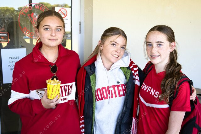 Mia Platt, Maya Wood and Imogen Cox at the Two Wells football and netball on Saturday. (Michael Slattery: 480251_01)