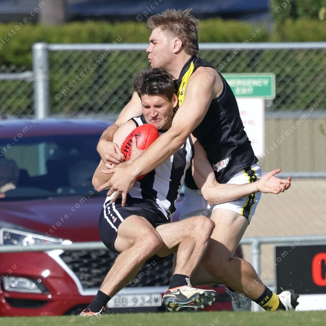Samuel Falland wraps up Daniel Gonzalez in a crunching tackle. (476143_01)