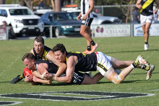 Tanunda’s five-goal star Mark Evans is gang-tackled by Nicholas Madden and Bart Ryan. (476143_04)