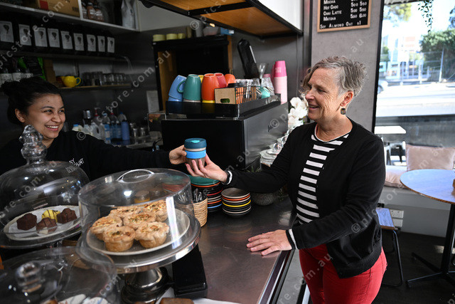 Pic of cafe staff Binni Manandhar and Deputy Bernadette Thomas promoting Plastic Free July at Footscray cafe. Photo by Damjan Janevski. 482729_04