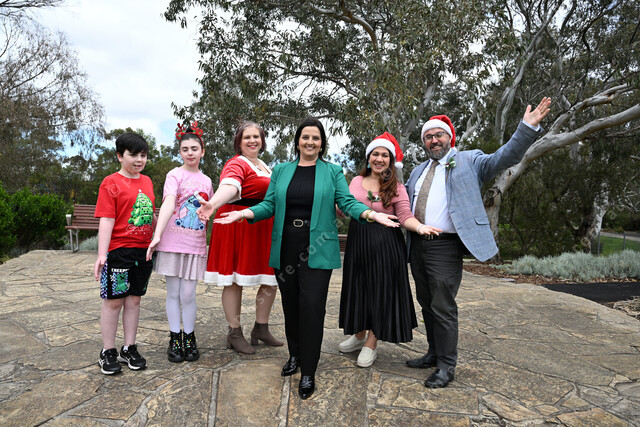 Christmas carols. Melton City Mayor Lara Carli (in the centre), with mum Jasmine Lynch and her kids Liam (10) and Annabelle (12); and Carla and Derek Bendall from MPA Singers. (Damjan Janevski). 520111_04