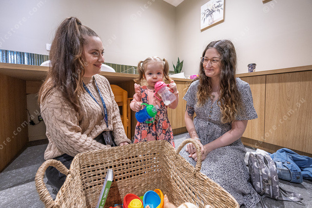 L-R Jessica Coenen (Maternal Childcare Nurse), (Ruby 17 months old) and Jessica Loomes (Mum).