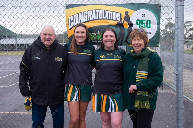 Merridie and Nicole McLaren, middle, are congratulated by their parents before their milestone match. (Dani Brown: 488623_03)