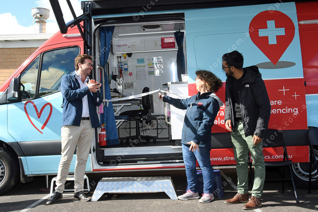 Nic Brown (CEO Street Side Medics) and Kate (Street Side Medics) with Janik Joshua (Cornerstone) cutting the ribbon (bandage) 518071_06