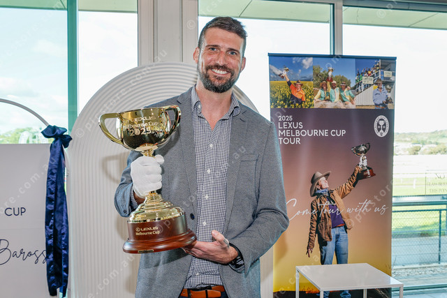 Town of Gawler Acting Mayor Nathan Shanks with the 2025 Lexus Melbourne Cup Trophy. 487617_04