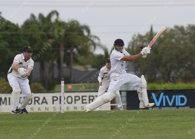 Thomas Vadlja during the 2025 Sunraysia Cricket Association Cricket – 1st Division Two Day Match 3 match between Mildura East CC 1sts and Ouyen Rams CC 1sts.