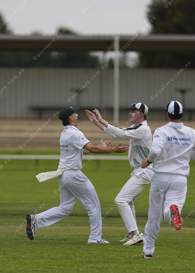 Jubilation when Chase Stone was run out by Taj Hill during the 2025 Sunraysia Cricket Association Cricket – 1st Division Two Day Match 3 match between Irymple CC 1sts and Mildura West CC 1sts .