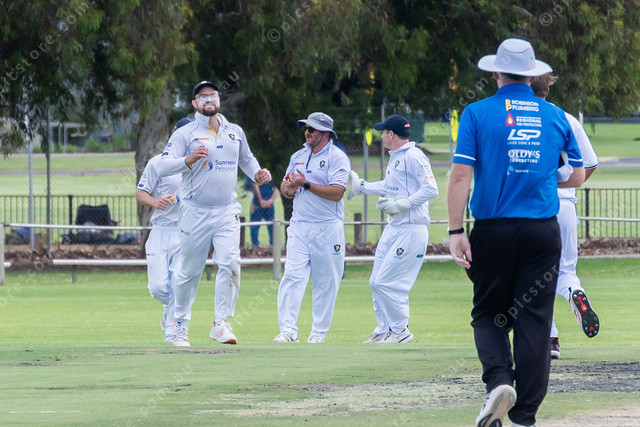 Irymple players celebrate the dismissal of Nick Giofre, caught by Jarrad Armsden off the bowling of Jayden Hunt. Picture: Ben Gross 519617_06