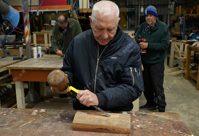 Whittlesea Men’s Shed. Pic of Eric Gunstone, Menshed president at the front, and members Greg Metcalf and Phil Berchdlot. Photo by Damjan Janevski. 483041_04