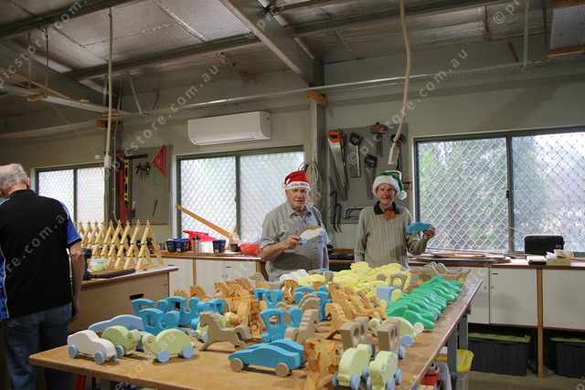 Trevor Bishop and John Hubbard with some of the Christmas toys made by Victor Harbor Men’s Shed members to be handed out at this year’s Christmas Parade. (Dee Elferink: 517577_06)