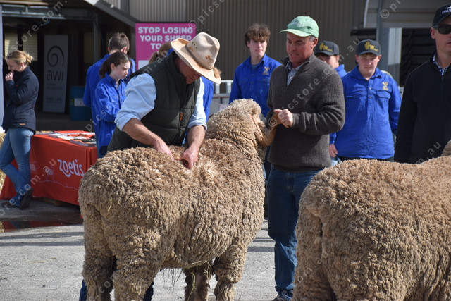 Judge Ed Morgan judging the Greenfields ram, held by Robert Sullivan. (494982)
