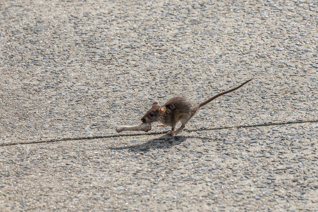 A Rat carrying a bone from next to the road towards the scrub next to the bus parking area.