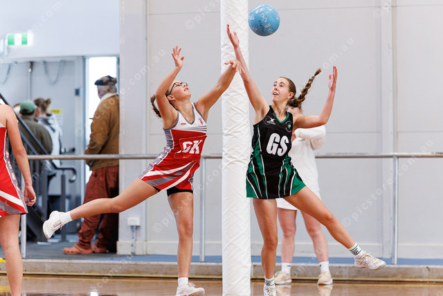 MGNA’s Mia Forrest and BLGNA’s Lily Watts chase a high ball
