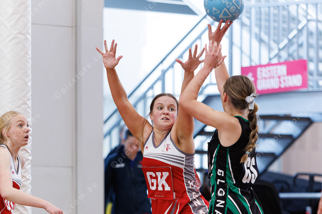MGNA’s Caelin Hayman tries to block a shot for goal from BLGNA’s Lily Watts