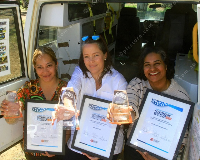 MIDWIVES: Joeleen Brown, Rebecca Schultz and Tharumarani Tharumalingam in a bush ambulance with their Nursing and Midwifery Awards. (PIC: PHIL WILLIAMS 478552_06)
