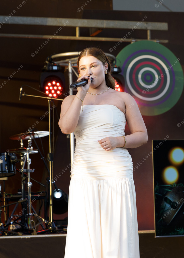 Hazel Symons, Mildura local and former Australian Idol contestant performs at the Mildura Carols by Candle Light held at Nowingi Place in Mildura on Saturday 13 December 2025.