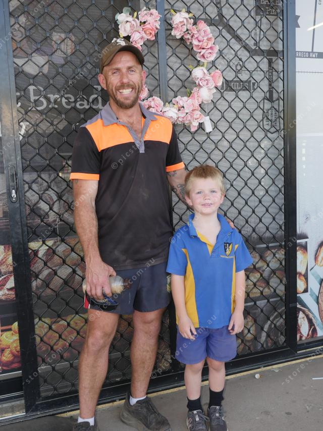 Brett Gorry owner of Maces Hot Bread is standing with his son Toby with their pink wreath in support of Pinking up Miles. 509755_02