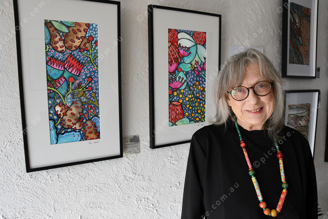 Milie Woods with her artwork titled ‘Banksia pods and Spots’ and ‘Wattle, gumnuts and spots’ 483734_02